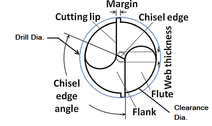 Drill Dia. Chisel Angle, Clearance Dia., Margin, Web thickness etc.